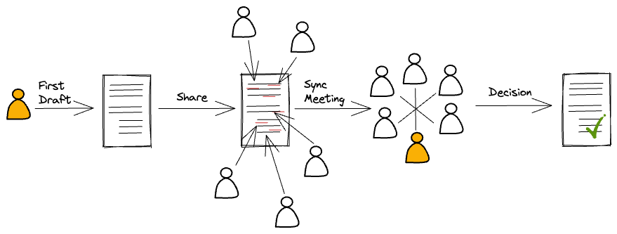 In the document, we introduce the new feature requirements and state the objective: "agree on an implementation detail". Then, we write our preferred solution. That means we must think about and solve the problem before sharing and asking for feedback.