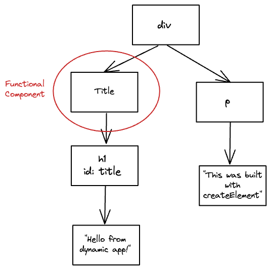const Title = () => createElement("h1", {}, ["Hello from dynamic app!"]);Our virtual DOM now has a functional component: