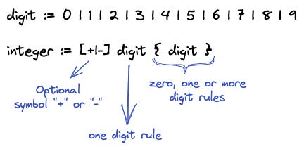integer := [+|-] digit { digit }EBNF is a list of rules: