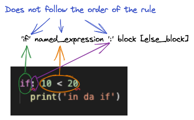 It starts with the "if" keyword, then a rule called named_expression. Then a colon ":" then a rule called block and an optional else_block.