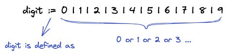 digit := 0 | 1 | 2 | 3 | 4 | 5 | 6 | 7 | 8 | 9