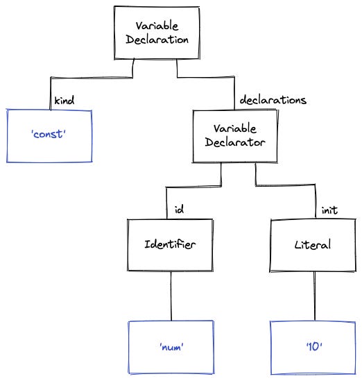 const num = 10;This code is represented by the following AST (following exactly the same structure as the library below for consistency):