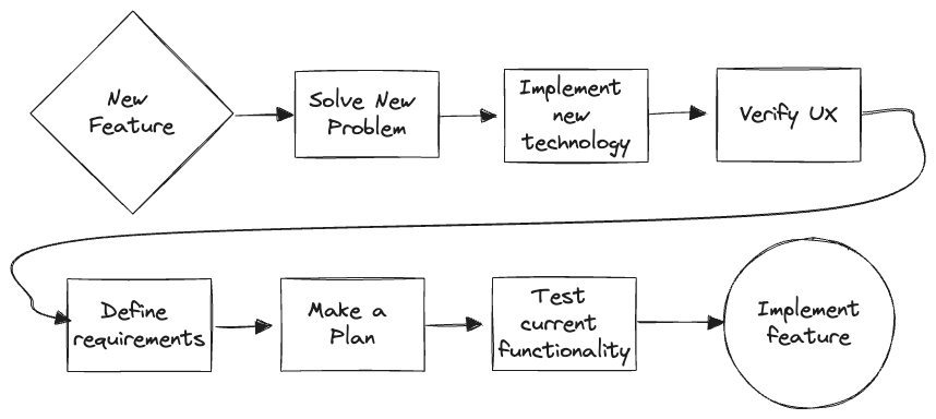 Don’t take this diagram at face value; reality is never so linear. We might want to start implementing parts that we know have no uncertainty. Or we might start with an implementation plan first and then discover we need a new technology.