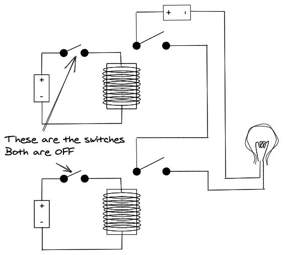 Let me prove how this circuit performs the calculations we want. In the previous diagram, we can see what happens when none of the switches is on.