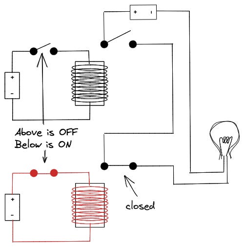 When the current passes in the first circuit, it triggers the electromagnet that pulls the lever from the other circuit, closing it.