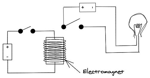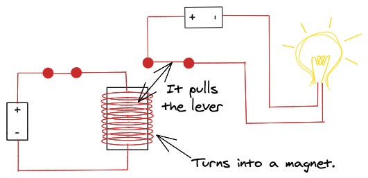 A relay is similar to a switch. However, instead of switching manually, the relay uses an electromagnet. An electromagnet is a device that becomes a magnet when electricity passes through it. Next to it, there is a lever that enables another circuit. When the electromagnet turns into a magnet, it pulls this other lever and enables the other circuit.