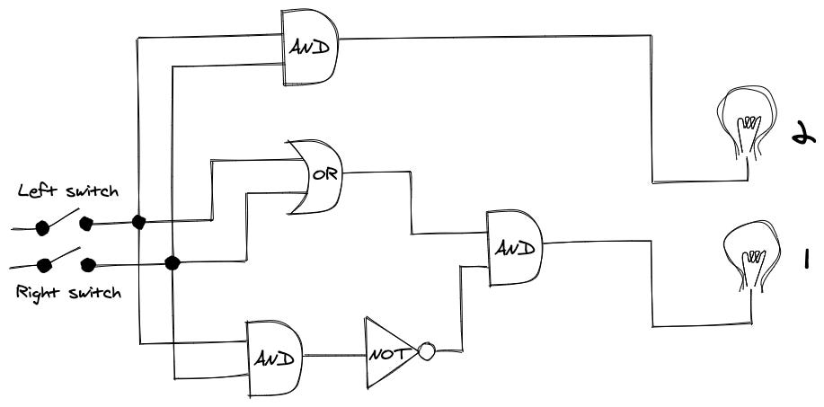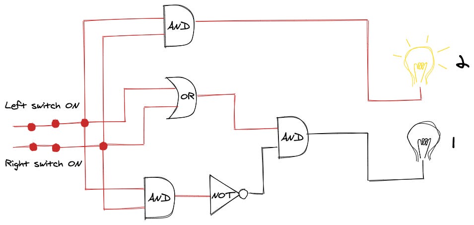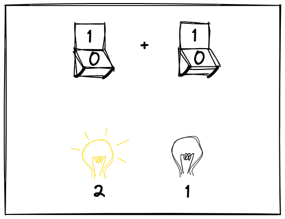 Both switches are on (1 + 1), the lightbulb of 2 is on, and the 1 is off.