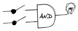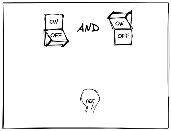 Let’s build the AND logic operation with electric circuits. We need two switches, and the lightbulb must shine only when both switches are on.
