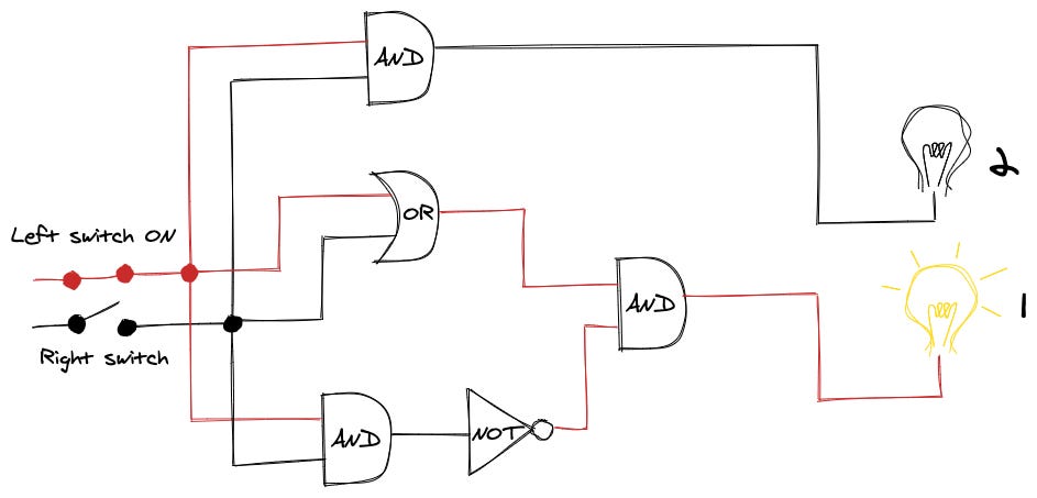 Let me show what happens when only one of the switches is on: