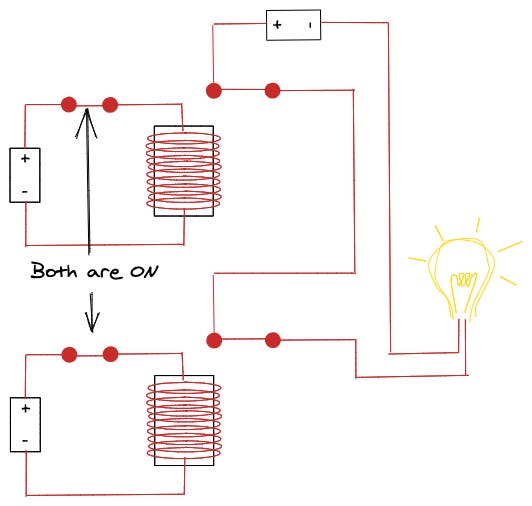 When only one is on, the lightbulb is off because no current flows through it.