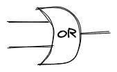 OR means that the lightbulb is on when any of the switches –or both– is on. The following is how to draw an OR. It has the shape of a bow.