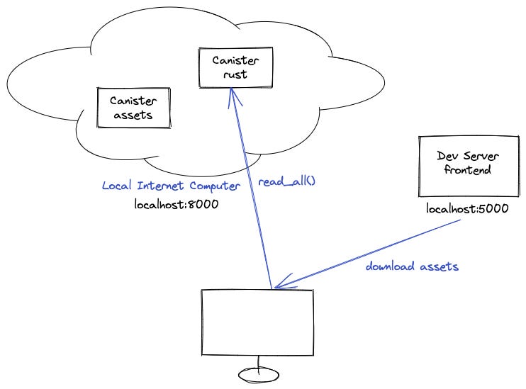 Remember that “dfx” runs a local replica of the IC where the canisters are deployed. Our backend is in this local replica and runs by default on “localhost:8000”. Yet, our development server might be running in another host, let’s say “localhost:5000”.