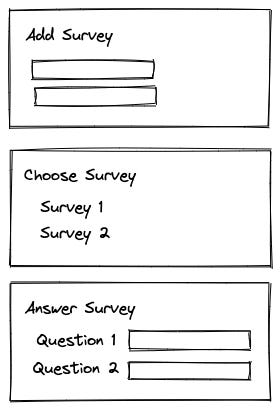 The example application is a survey management tool where users can create surveys, select, and reply to one. There are no login or registration capabilities; everybody works on the same surveys and data.