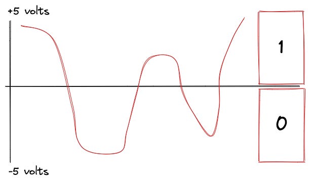 When we use binary, we need to divide the electricity that passes through a transistor into two buckets, one that means 0 and another that means 1.